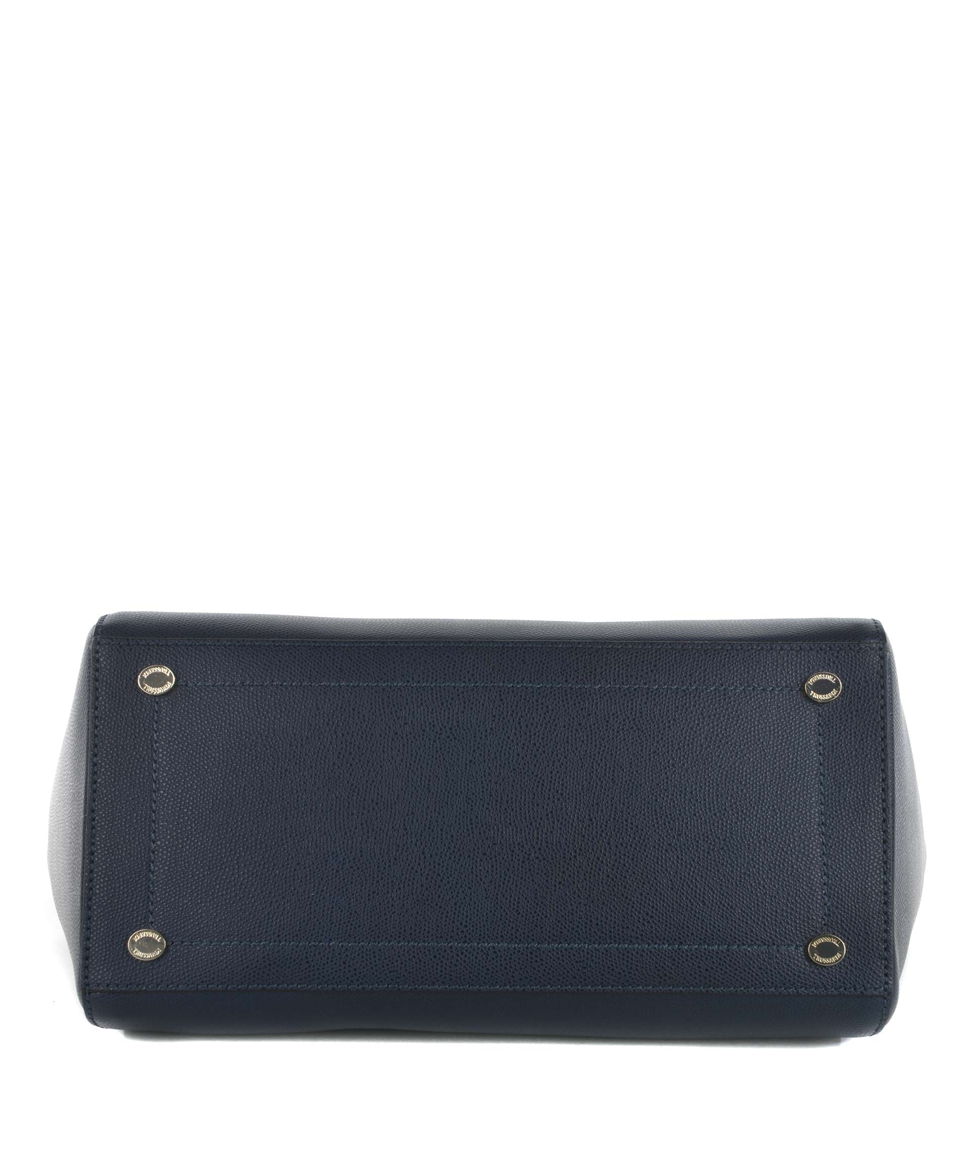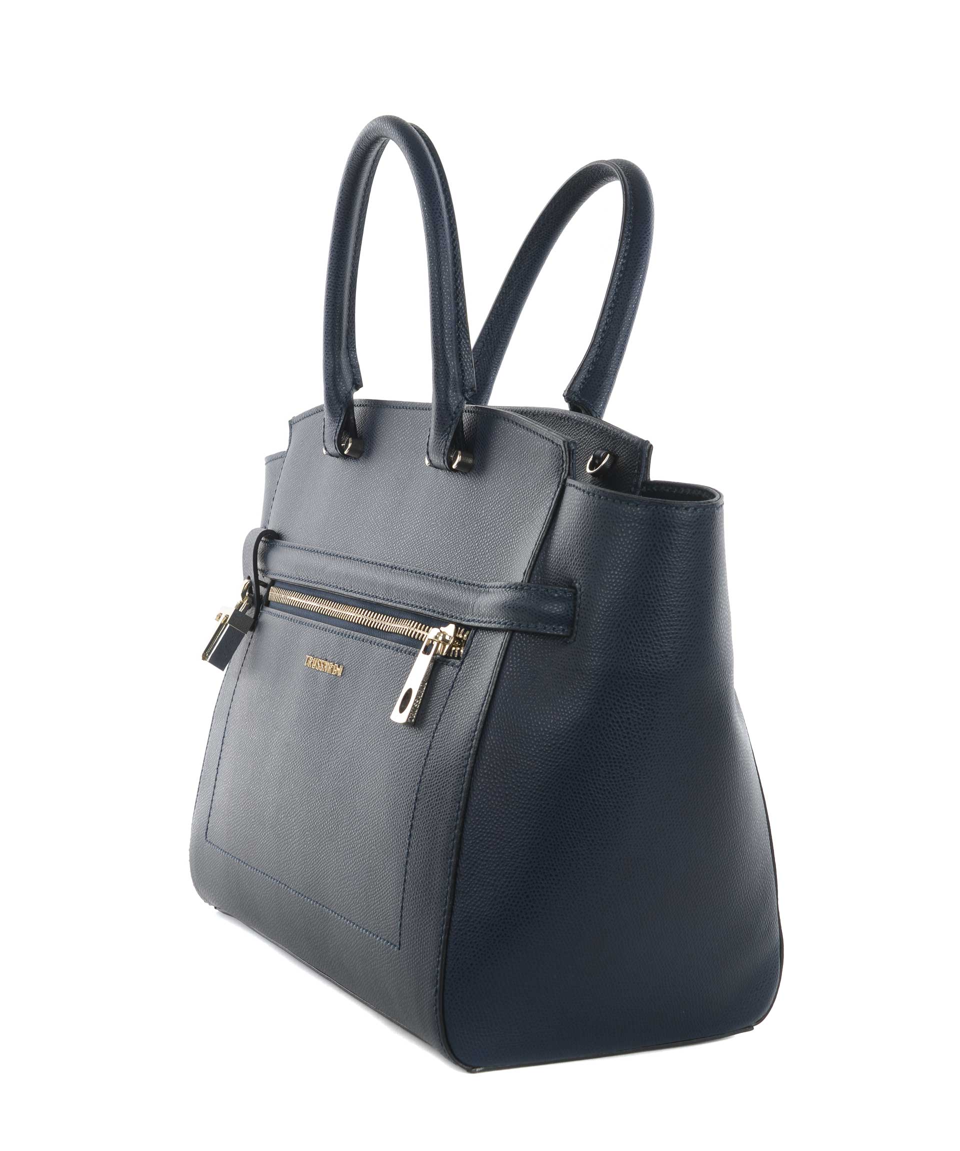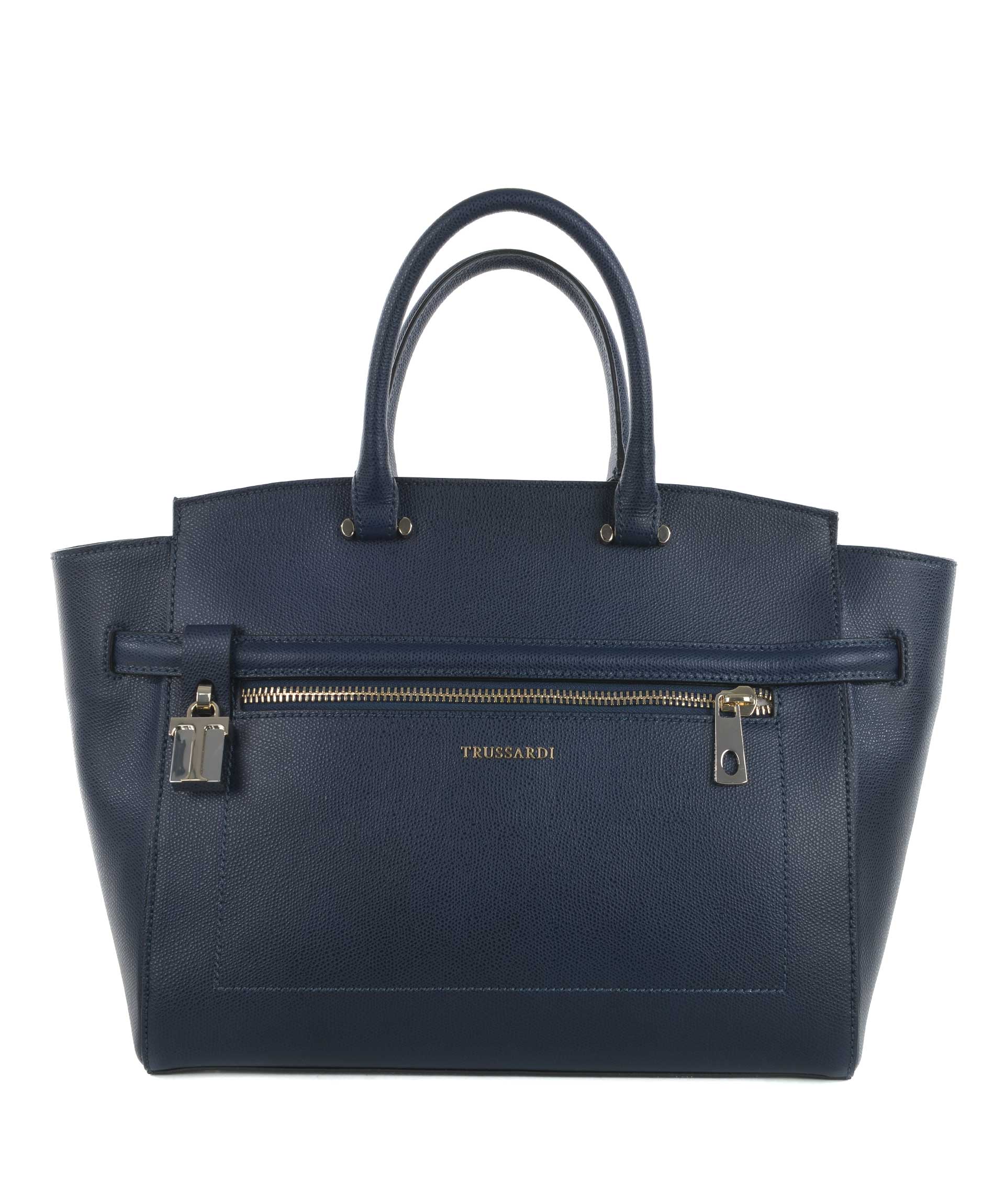 Borsa Trussardi in pelle saffiano Blu. Due manici semirigidi in pelle. Tracolla in pelle removibile e regolabile. Tasca frontale con zip. Chiusura con zip. All'interno tasca con zip e tasche applicate. Fodera logata. Logo frontale in metallo dorato. Piedini metallici alla base. Rifiniture in metallo dorato.