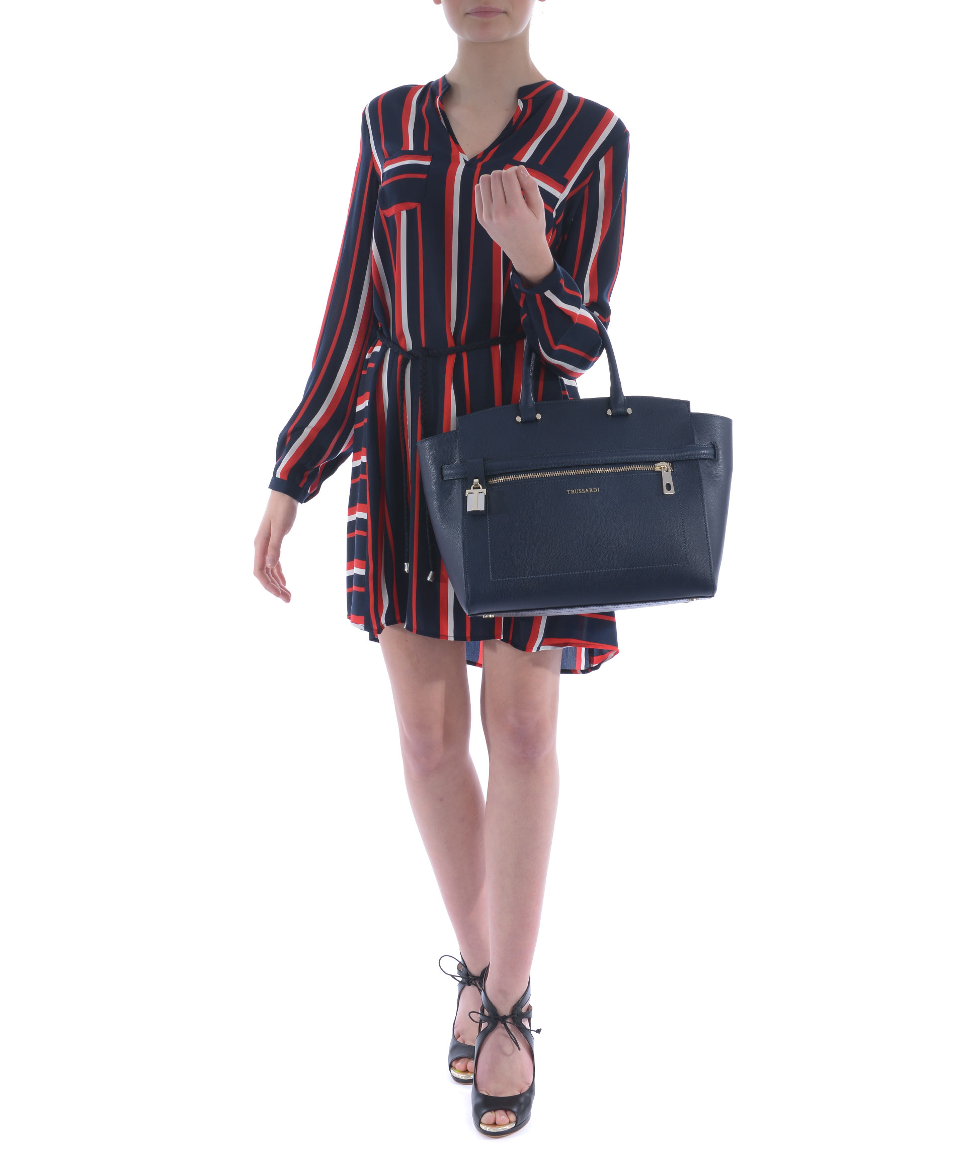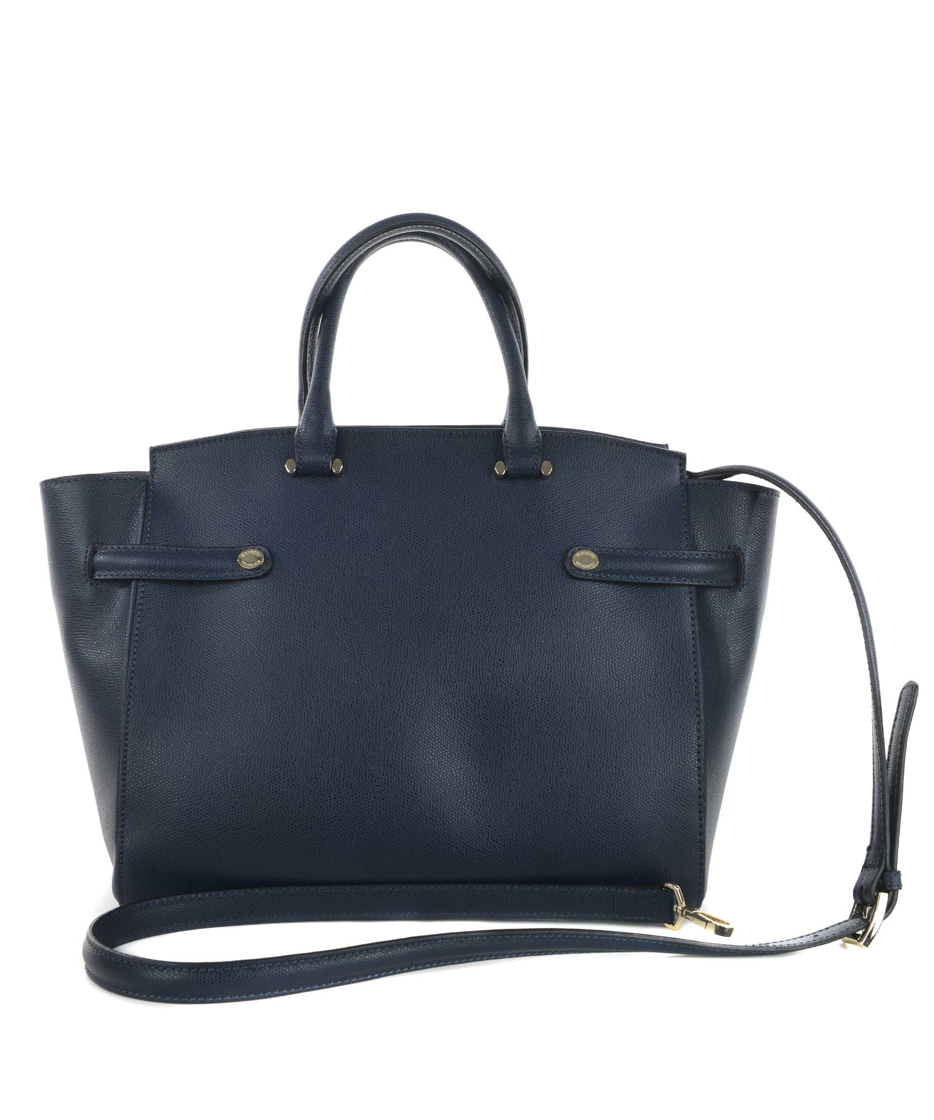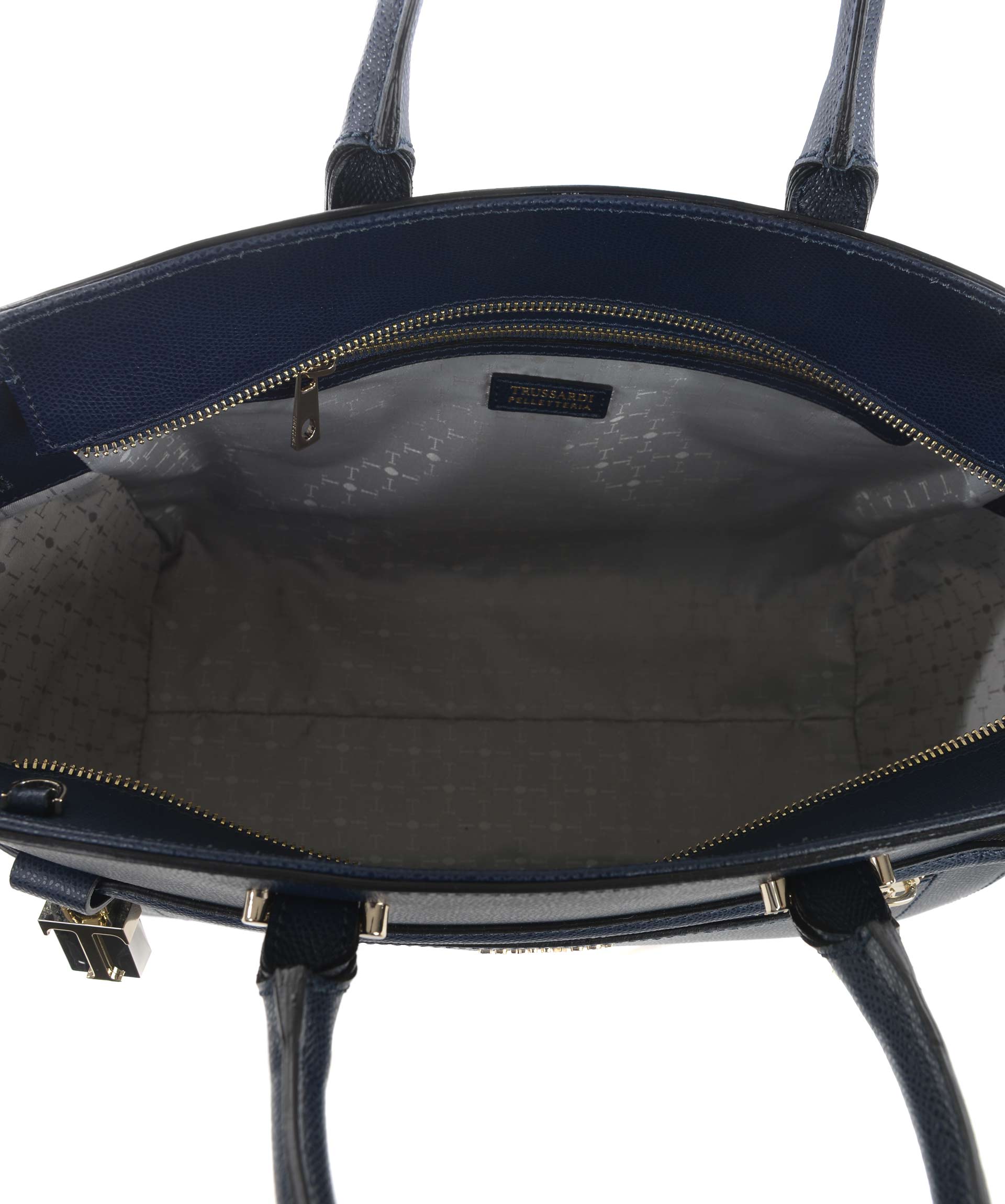 Borsa Trussardi in pelle saffiano Blu. Due manici semirigidi in pelle. Tracolla in pelle removibile e regolabile. Tasca frontale con zip. Chiusura con zip. All'interno tasca con zip e tasche applicate. Fodera logata. Logo frontale in metallo dorato. Piedini metallici alla base. Rifiniture in metallo dorato.
