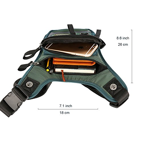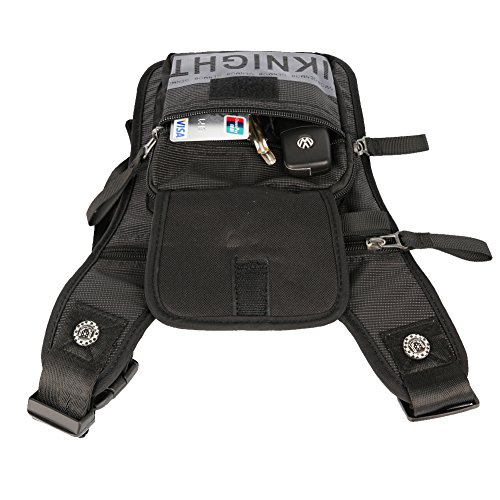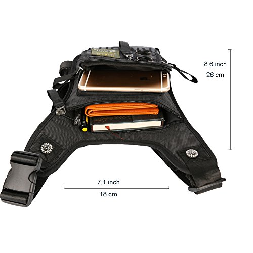 -. Feature : Various Compartments. Comes with large/medium/small compartments for holding different size items, convenient to put things in or out / Decent and Waterproof. Made of durable nylon and polyester, light weight and keep long-lasting performance. / Multiple Use Functions. Comes with thigh strap, fix bag safely around the thigh easily keep items stable in the bag. Very good for cycling, motorcycling, hiking, trekking. / Size: 7.1"(Width) x 8.6"(Height) x 2.4"(Depth) inches / 18 x26 x 6 cm / Essential equipment bag for outdoor adventures or motorcycling.