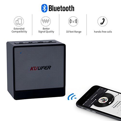 -. Feature : Wireless portable bluetooth speaker: Enjoy a High Definition stereo sound with a impressive volume. / Instantly connect to your smartphone from up to 33 feet away. KUUFER-A1 reconnects automatically to the last device used. / Built-in mic for hands-free calls. / 3 Hours of Music: Boasting a 800mAh lithium-ion battery, this Bluetooth speaker can play up to 60 songs at mid-level volume on a single charge. (Playtime varies by volume level and audio content). / What You Get: KUUFER Bluetooth speaker, Micro USB charging cable, welcome guide, our worry-free 18-month warranty and friendly customer service.