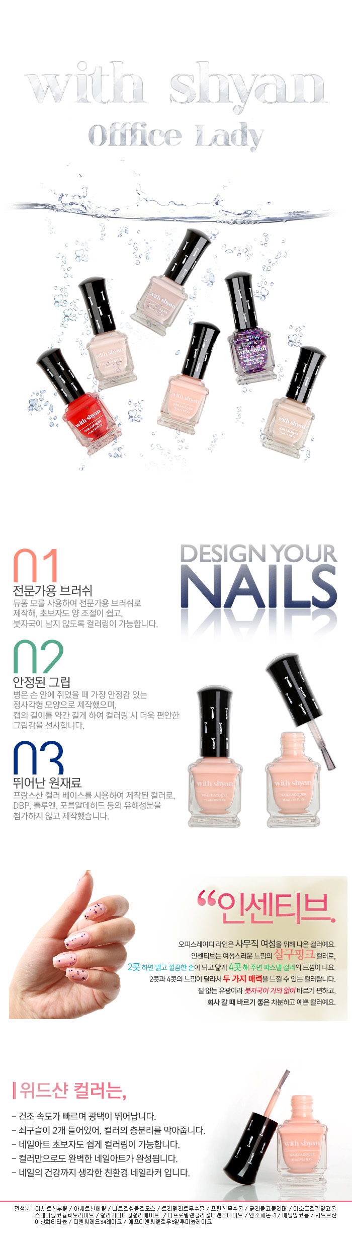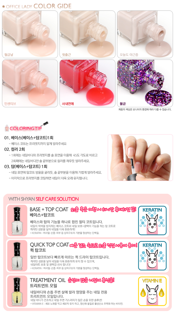 - 주요성분아세트산부틸,아세트산에틸,니트로셀룰로오스,트리멜리트무수물/프탈산무수물/글리콜코폴리머,이소프로필알코올,스테아랄코늄헥토라이트,실리카디메틸실리에이트,디프로필렌글리콜디벤조에이트,벤조페논-3,에틸알코올,시트르산,폴리에틸렌테프탈레이트,알루미늄분말,페로시안화철,레드옥사이드,에프디엔씨옐로우5알루미늄레이크,블랙옥사이드