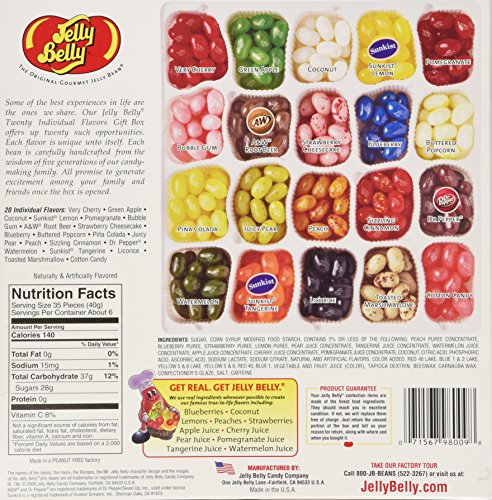 -. Feature : Includes the best 20 flavors Jelly Belly has to offer / Two 8.5oz gift boxes / Direct from the Jelly Belly factory / Gluten-free, peanut-free, OU kosher; zero fat and only 4 calories per bean / Great as a gift or for celebration