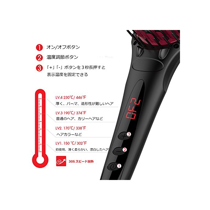 【16단계 온도 조절·화상 방지】온도는 16단계 설정이 가능.80℃부터 230℃까지 조절 가능합니다.연모세모 데미지모경 모태털까지 폭넓게 대응에서 옵니다.온도가 오른 상태에서도 브러시가 빨간 부분이 어느(있는) 모아 두고, 만일 손으로 쥐어 버리거나 닿아 버려도그 부분은 뜨겁지 않기 때문에 화상 심장배도 없습니다.