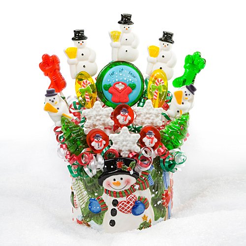 Binding : Health and Beauty Product Description Let it snow, let it snow. Send some warm wishes this winter with this beautiful snowman ceramic container filled with eighteen hand-made, hard-candy lollipops. Snowmen, trees, snowflakes and candy-canes lollipops add a festive feeling to this adorable bouquet. The delicious lollipops are in marshmallow, cherry, watermelon and peppermint flavors. Spread some sweet cheer this winter to a co-worker, teacher or family member with an unforgettable gift. Approx. Size 6"x10"x13" 0