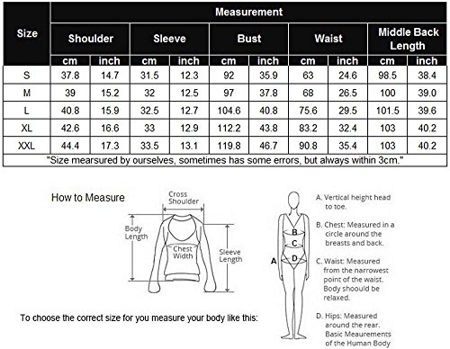 Size: There are 5 sizes (S/M/L/XL/XXL) available. Please check the size chart and allow 1-2cm differs due to manual measurement, thanks (All measurement in cm and please note 1cm=0.39inch)