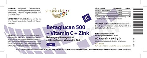 -. Feature : Contents: 90 capsules = 73,8g / Ingredients: Beta glucan (1.3-1.6 linked) from yeast, L-ascorbic acid, capsule (gelatin), zinc gluconate, release agent: magnesium stearate. / Sested use: 1 capsule daily with liquid, best with a meal. / Expiry date: at least 1 year. / Cheap and fast shipping from Germany within 1 to 2 weeks.