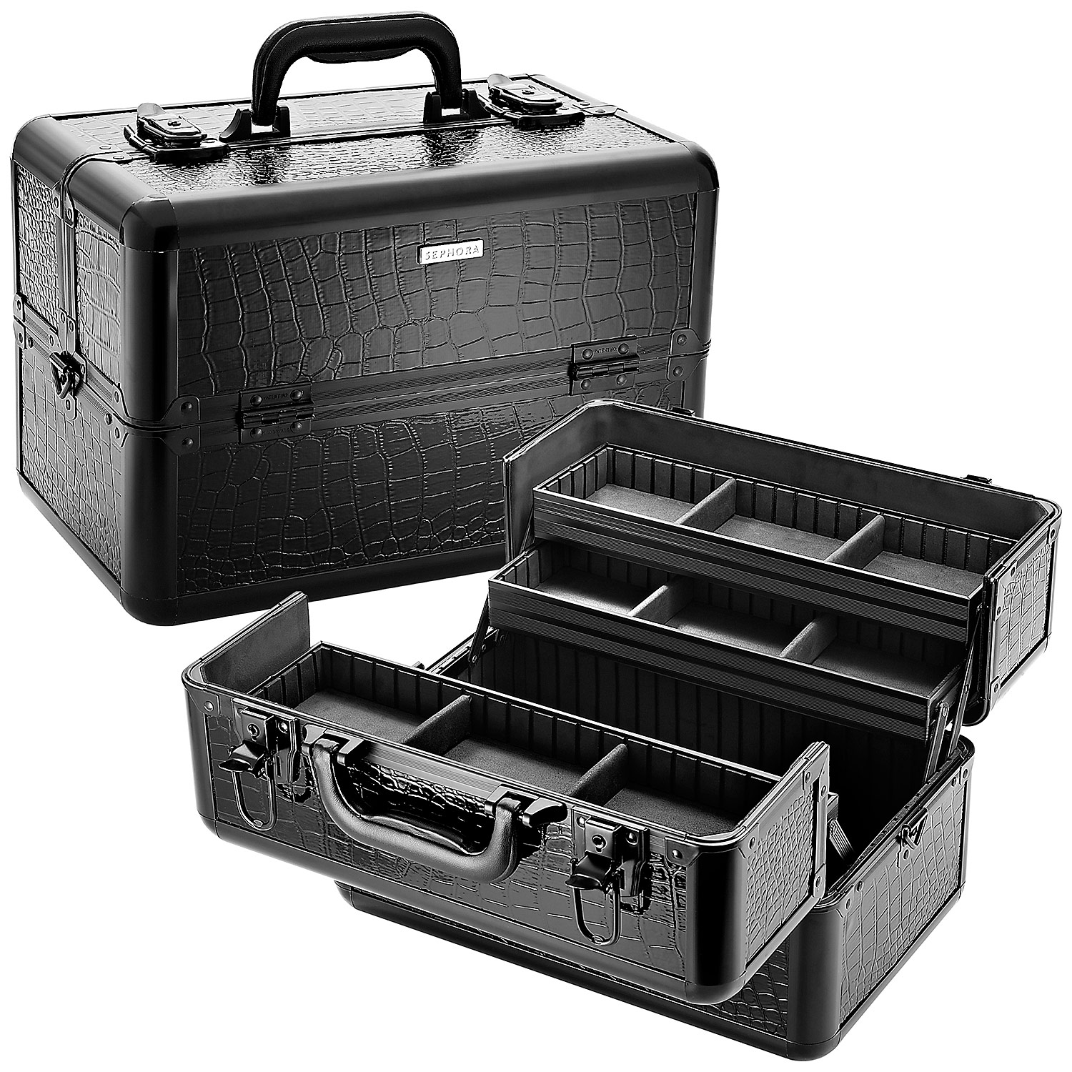 Organize and store all your beauty essentials in one chic case designed with faux crocodile print. The glossy black finish with chrome detailing adds drama and sophistication to this convenient organizer. Use the adjustable fold-out trays and multiple compartments to house your makeup, nail products, tools, and more. The bottom level has adjustable compartments for storing multiple size products and the two-tier stacking tray on both sides allows plenty of room for full-size products to stand upright. This train case comes with its own lock and key to keep your items safe and sound and the professional grade construction is highly durable for on the road bumps and bruises.