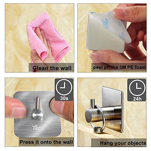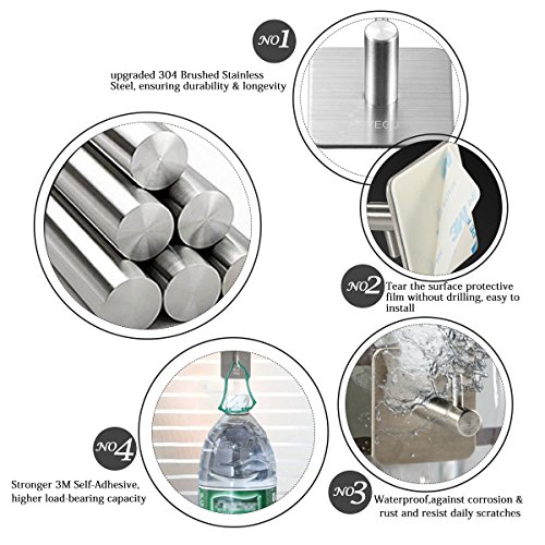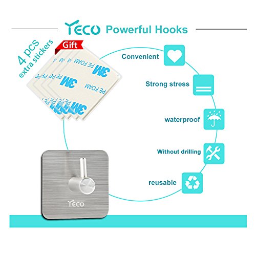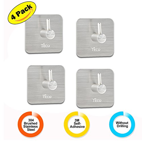 3M Self Adhesive Hooks, YECO 304 Brushed Stainless Steel Waterproof Oilproof Closets Coat Towel Robe Hook Wall Mount for Kitchen Bathroom–Easy Installation without Drilling (4 Pack)