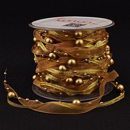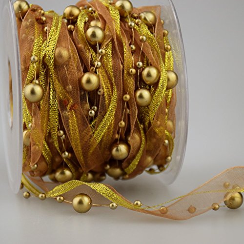 Fowod 3 Strings Beaded Ribbon, Pearl String, Satin Ribbon and Organza Ribbon, 33 Feet, Gold