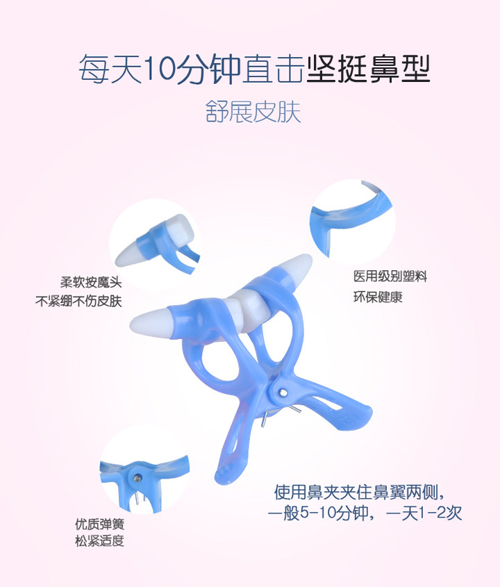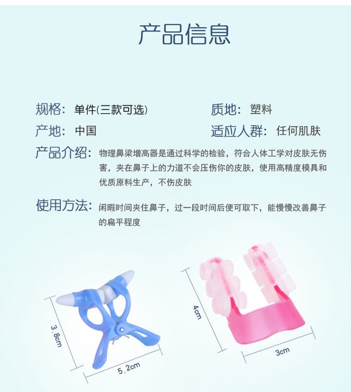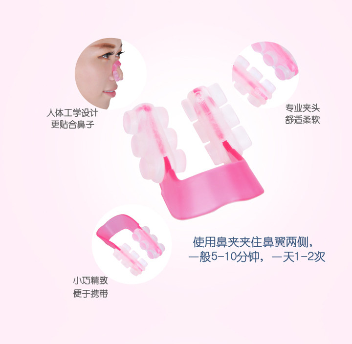 Name: Fast Nose Heightr Size: about 5*4.5cm Material: ABS resin Color as shown Introduction: Just use 10 to 15 minutes a day, you can have the ideal beauty of nose! . Since the nose is in the center of the face, there is a straight nose, and the entire face will look more symmetrical and beautiful, letting you talk to your nose and say Bye Bye! Become a confident beauty.