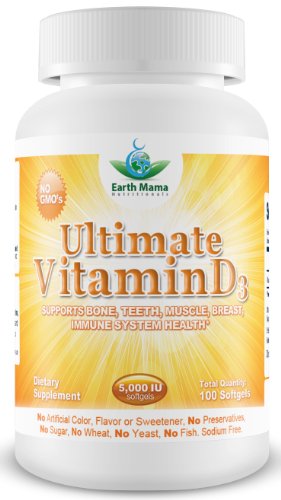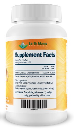 -. Binding : Health and Beauty -. Brand : Earth Mama -. Label : Earth Mama Nutritionals -. Manufacturer : Earth Mama Nutritionals -. ProductGroup : Health and Beauty -. ProductTypeName : HEALTH_PERSONAL_CARE -. Publisher : Earth Mama Nutritionals -. Studio : Earth Mama Nutritionals -. Title : #1 Vitamin D3 5000 IU Cholecalciferol - Made from All Natural Lanolin - GMO-Free, Preservative-Free - High Potency Vitamin D3 Supplement for Bone, Heart, Muscle & Immune System Health & Vitality - 100 Day Supply