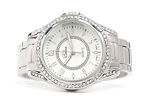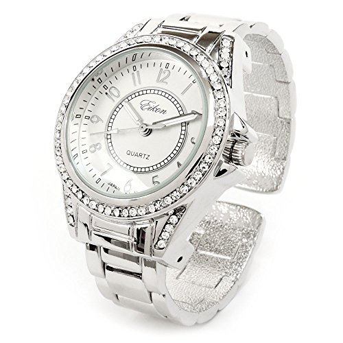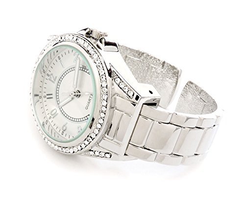 FTW Silver Tone Crystal Bezel Iced Out Ladies Quartz Wrist Watch Stainless Steel, Fashion Luxury Dress Bangle Cuff Watches for Women