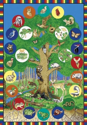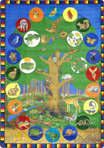 Studio : Joy Carpets Publisher : Joy Carpets Binding : Kitchen Product Description 1448C Rug Size: 5'4" x 7'8" Features: -StainMaster technology.-Rectangular shape.-Features a natural Tree of Life scene with animals and educational images.-A Tree of Life instructional guide is mailed with every rug.-Lifetime antistatic, antimicrobial, soil and stain protections.-Material: 100% high twist premium nylon.-2-Ply heat set yarn.-Technique: Tufted cut pile.-High fiber density.-Serging: Bound and serged for maximum durability.-Traffic Rating: Residential or commercial.-Maintenance: Hot water extraction - Vacuum regularly.-Exceeds most stringent indoor air quality standards.-Exceeds National Green Building Standards.-Complies with California OEHHA Guidelines.-5'4' X 7'8'.-7'8' x 10'9'.-10'9' x 13'2'. Color/Finish: -Bold, colorful design. Warranty: -10 year wear warranty. 0