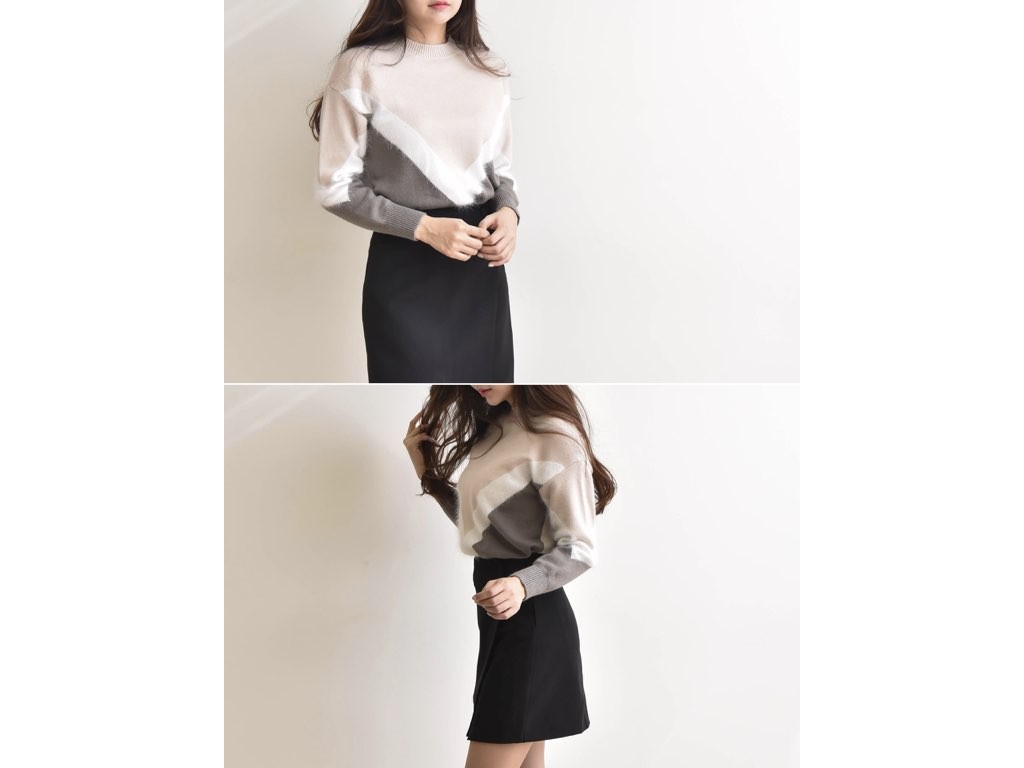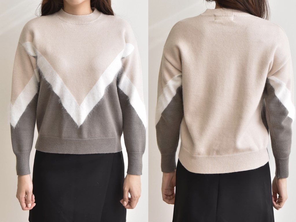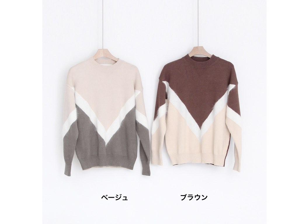 アンゴラ混 V模様のニットです。V模様の部分がアンゴラ素材となっています。とても肌触りがよく、高級感があります。インナーに着ても、V模様がアクセントになってともてオシャレですね。1.基本情報色:2色展開(ベージュ/ブラウン)サイズ:Free素材:ウール10%、アンゴラ5%、アクリル35%、ポリエステル50%製造国:korea2.サイズ情報肩幅:48cm 身幅(胸断面):48cm 腕の長さ:47cm 着丈(前):55cm (サイズは計る方法に応じて±2〜3cmの誤差があります。ご了承お願い致します)モデル着用サイズ:F※着用モデル(163cm、体重47kg、足のサイズ24.5cm)3.その他の情報厚み:中間透け感:なし伸縮性:高裏地:なし洗濯方法:ドライ(クリーニング)[注意事項]お取り寄せ商品は、海外より仕入れるため納品まで約10日前後いただきます。また店舗でも販売しており、在庫切れになる場合もございます。ご了承お願い致します。