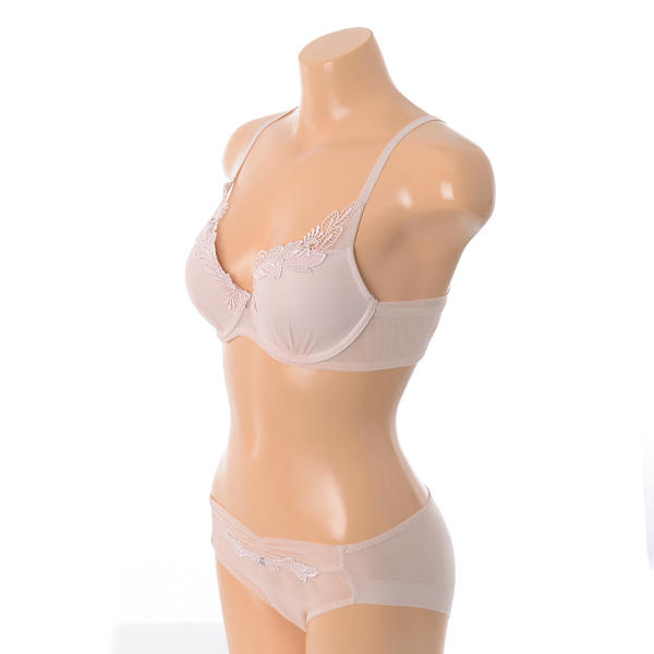 세련된 캐미컬 자수가 고급스러운 3/4컵 몰드 브래지어 햄팬티 세트 스킨 컬러입니다.