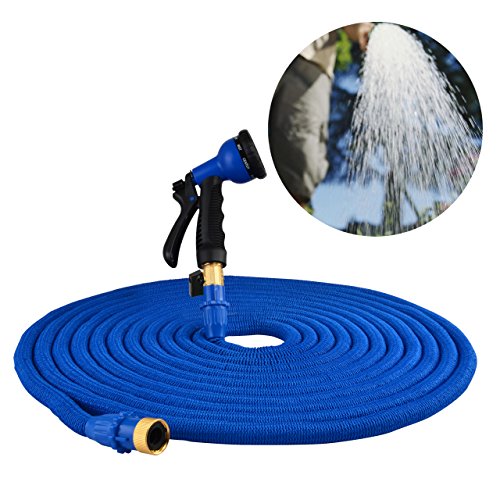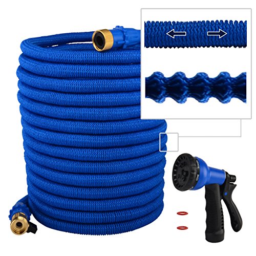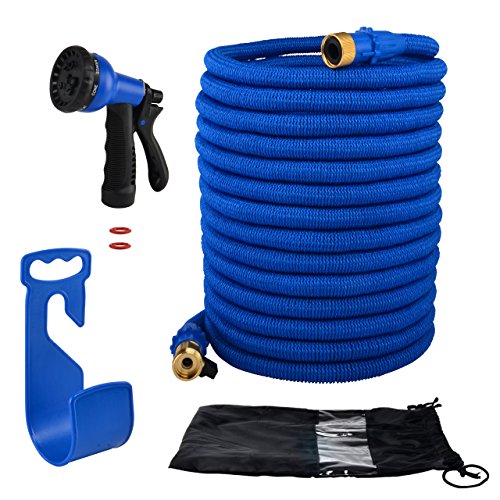 Garden Hose Improved Version,Garden Hose Pipe Expandable with Extra Strength Stretch Material and Brass Connectors Bonus FREE 8 Way Spray Nozzle,Carrying Bag and Holder Hanger (Blue)by HOMER (100ft)