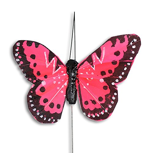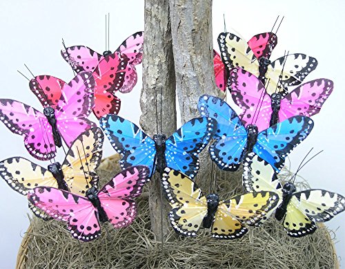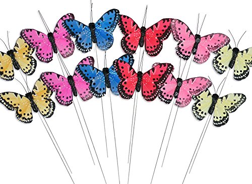 - BUTTERFLY STICKS. SET of 12 floral pick butterflies with feather wings. Assorted colorful butterflies on metal wire plant stakes.
