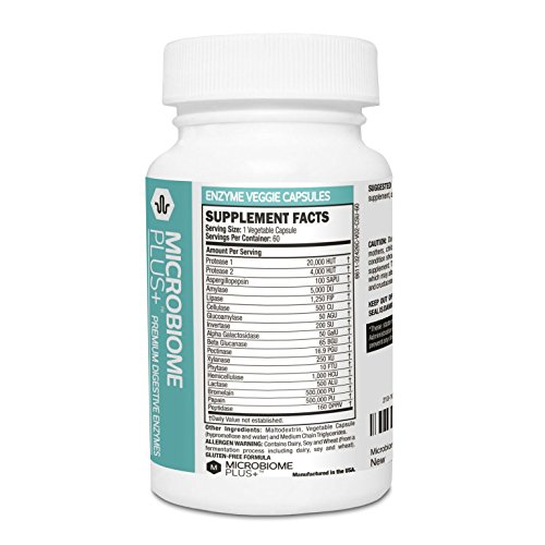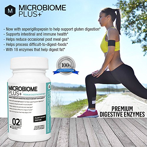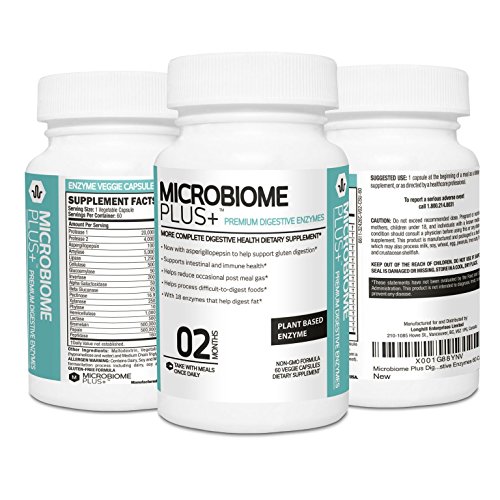 BEST DIGESTIVE MULTI ENZYME SUPPLEMENT IN THE MARKET. Digestion Plant Based Enzymes for Stomach Relief, Indigestion, Bloating, Gas and Improved Overall Health. Do you suffer from frequent stomach pains? Do you get post-meal gas and bloating? Are your energy levels being drained? Are you looking for an effective relief from this? Premium Digestive Enzymes by Microbiome Plus with 18 Enzymes for Digestion are specially formulated with a powerful enzyme matrix to help you process hard-to-digest foods, such as gluten, protein, carbs and fat. Taking this supplement on a regular basis will improve your energy levels, strengthen your immune system and leave you feeling healthier and more energetic. Highly Effective Multi-Enzyme Composition: Our digestive capsules feature a wide spectrum of natural digestive enzymes that include aspergillopepsin, protease, lipase, amylase, cellulose, glocoamylase, bromelain, invertase, lactase, papain, pectinase, xylanase and more. These enzymes act fast to fight indigestion and improve nutrient absorption. You will feel a change soon after taking our digestive supplements, making them one of the fastest acting digestive supplements in the market. Enzymes for digestion are critical for good health. Here is why these digestive enzymes are a must have: they are natural and non-GMO - contain a wide spectrum of powerful enzymes - are fast acting relief from indigestion - are safe and healthy for both men and women - support intestinal and immune health - support gluten and fat digestion - help process difficult-to-digest foods - reduce post meal gas and bloating.Feature