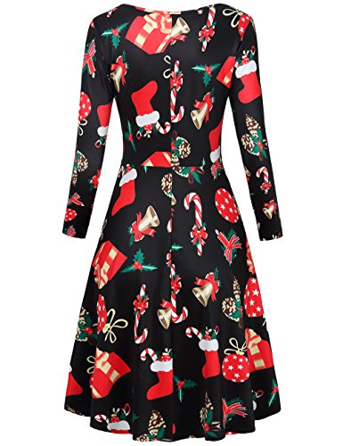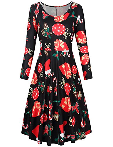FANSIC Women's Christmas Dress Santa Claus Casual Long Sleeve Round Neck Swing A Line Party Dress