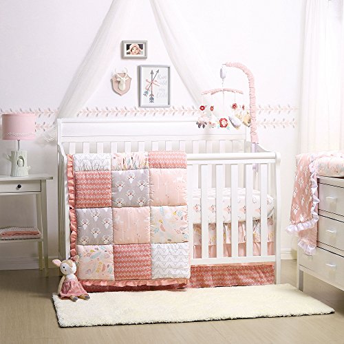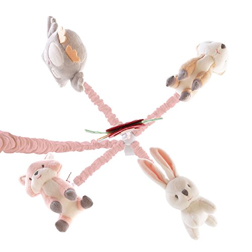 This adorable Peanut Shell musical mobile features plush forest animals, including deer, bunny, owl, and fox, suspended from a ribbon on a cross-bar construction mobile