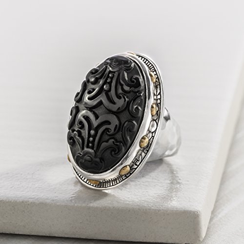 -. Feature : The 27 ct agate stone of the Into the Night Ring features ornate details and is outlined by brass and sterling silver accents / MIX OF CULTURE: Cultural influences can be found everywhere you look - from building architecture to your favorite restaurant or song - and now, your favorite piece of jewelry. Mixing metals, materials, tones and textures allows jewelry to tell a narrative. Let this collection, filled with ornate detailing and organic designs, tell your story. / AGATE: Creatively striped by nature, each stone is guaranteed to be one-of-a-kind / BRASS & STERLING SILVER: The combination of copper and zinc gives brass a soft, yellow glow and its malleable nature makes it an artisan favorite; when this golden-hued metal is used alongside Silpada's signature metal of sterling silver, it creates breathtaking antiqued or mixed-metal looks / Ring face measures 1 1/4 inches in width