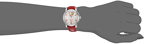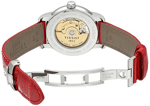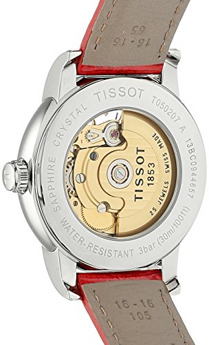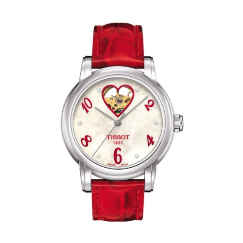 Polished stainless steel case (35 mm in diameter, 9.35 mm thick), Sapphire crystal snap-down caseback, Mother of pearl dial, Silvertone hands, Red Arabic numerals, 6 diamond hour markers (TW 0.034 carat), Sweep second hand, Heart shaped aperture revealing the movement at the 12 o'clock position, Scratch resistant sapphire crystal, Swiss automatic movement, ETA caliber 2824-2, Power reserve of 42 hours, Water resistant to 3 ATM/30 meters/99 feet, Shiny red leather strap, Deployment clasp, Model number: T050.207.16.116.02.Feature