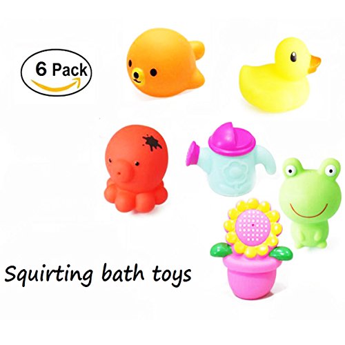 -. Feature : 6 assorted characters: It includes duck, octopus, frog, sea lions and so on / Enjoy the bathtub time fun: These colorful bath toys can squirt water when squeezed making it really fun / Environmental and non-toxic material, high quality workmanship. Safe and smell free / Different toys have different sizes, please see the pictures as a reference. Perfect size and shape for babies little hands to hold / Free bath organizer: This free bath organizer is large and sturdy enough to hold more kids toys, keep the baby toys clean and dry