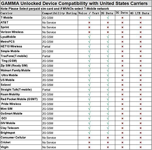 -. Feature : 5 Games Include, Sokoban, Link game, Gobang, Snake, Tetris. / 2.4" TFT Screen Display; VGA Camera (320 x 240 pixels) w/ LED Flash + Video / Spreadtrun Processor, 1600 mAh Big Battery, FM Radio, MP3/ MP4 Player, Bluetooth: v2.0 / 3.5mm Audio Jack + microSD Slot Expandable up to 32GB / GSM Quad band 2G (850/900/1800/1900): compatibility Nationwide on T-Mobile, Straight Talk, Simple Mobile, or any other carrier that accepts a 2G GSM Sim Card. Will NOT work with 3G only providers like ATT nor any CDMA Carriers
