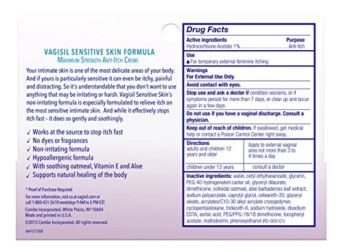 Your intimate area is one of the most delicate areas of your body. And if yours is particularly sensitive it can even be itchy, painful and distracting. So it's understandable that you don't want to use anything that may be irritating or harsh. Vagisil Sensitive Skin's non-irritating formula is especially formulated to relieve itch on the most sensitive intimate skin. And while it effectively stops itch fast- it does so soothingly. Intensive healing formula provides long-lasting relief with Hydrocortisone.Feature