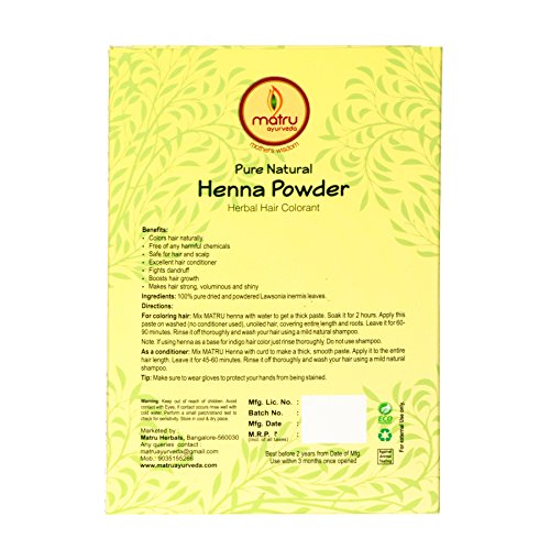 Studio : matru Publisher : matru Binding : Misc. Product Description High quality Henna Powder cultivated , processed and packed in india. The powder is made of only Henna leaves ensuring a high Lawsone content which imparts rich red color. It is not only an excellent dye but also used to deep condition the hair. It strengthens and protects hair from damage, soothes and seals the hair cuticle for greater shine and body. For coloring Hair: Mix MATRU henna with water to make a thick paste. Soak it for 2 hours. Apply this paste on washed (no conditioner used), unoiled hair, covering entire length and roots. Leave it for 60-90 minutes. Rinse it off thoroughly and wash your hair using a mild natural shampoo. Note: If using henna as a base for indigo hair color just rinse thoroughly. Do not use shampoo. As a conditioner: Mix MATRU henna with curd to make a thick, smooth paste. Apply it to the entire hair length leave it for 45-60 minutes.Rinse it off thoroughly and wash your hair using a mild natural shampoo. Tip: Make sure to wear gloves to protect your hands from being stained. 0