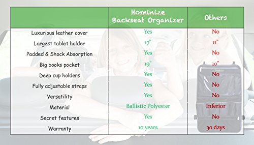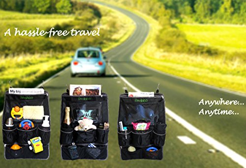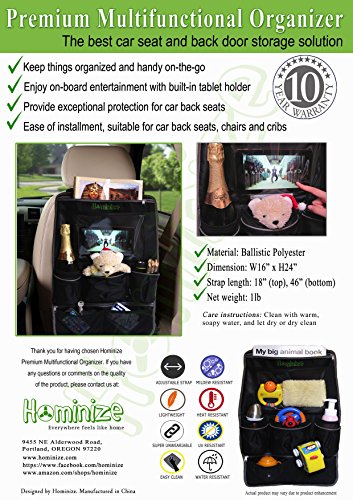The Hominize backseat organizer is a simple and handy solution to several problems in car. Made of Ballistic Polyester/Faux Leather in trendy Black/Grey, it fits nicely to your car front seat back like skin while giving you access to a live entertainment or reach other essentials instantly. From now on, you will have no more headache packing for road trips or facing hassles looking for stuffs in emergencies. It offers an Extremely Cool, Convenient way of organization for Enduring Journeys, keeping Complete Sanity for your car. And have your Little Ones bring along their Favorite Companions to all vacations! This is the PRICELESS GIFT TO YOUR LOVED ONES!