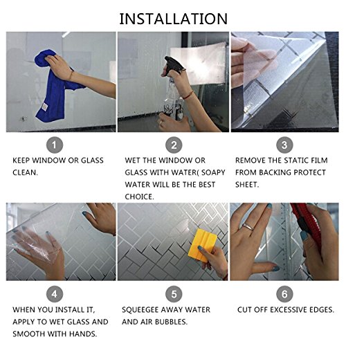 Step 1. Keep Window or Glass clean. Step 2. Wet the Window or Glass with water( Soapy water will be the best choice ). Step 3. Remove the Static Film from backing protect sheet ( Please MAKE SURE you have removed it before you apply the window film to glass). Step 4. When you install it, Apply to wet glass and smooth with hands. Step 5. Squeegee away water and air bubbles. Step 6. Much easier than Wall Decals, it's no problem for you. Step 7. Enjoy your works! :-). 0