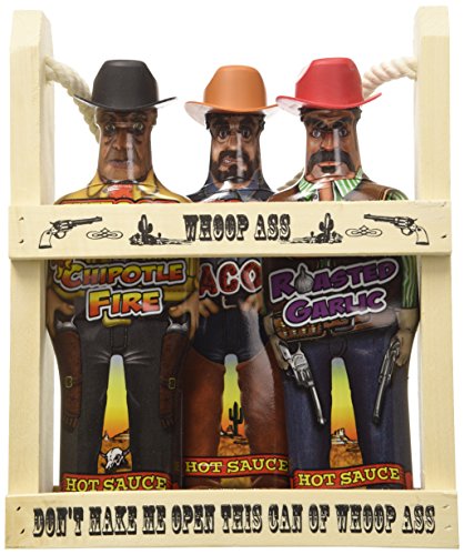 3 Cowboy shaped figuring bottles include these flavors: • Whoop Ass Chipotle Fire Hot Sauce • Whoop Ass Bacon Hot Sauce • Whoop Ass Roasted Garlic Hot Sauce