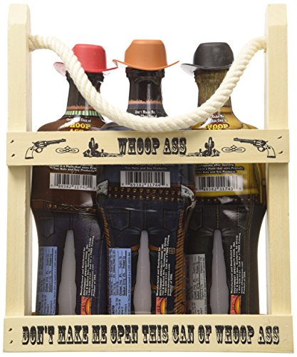 Whoop Ass Hot Sauce Wooden Crate Gift Set comes with three of the five Whoop Ass cowboy Hot Sauces in an easy to carry wooden crate.