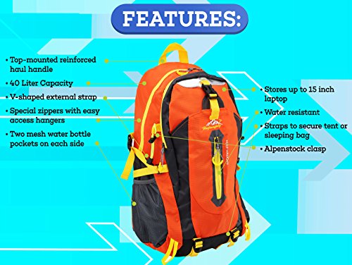 -. Brand : RUNPO(TM) -. Feature : MULTI- POCKETS smart design: it has a spacious main pocket with padded laptop compartment, Allows for Secure Storage of Laptop Up To 15" one external pocket with a special space for iPad or tablet, one "easy access pocket", an "outer pocket", and two mesh water bottle pockets on each side; / ADJUSTABLE and comfortable mounting system: straps to secure the tent or sleeping bag, adjustable chest and foam padded waist straps, reinforced handle, two D-rings hangers, V-shaped external strap, reinforced special zippers with easy access hangers, soft back-pads plus thick back cushions; / WATER RESISTANT: it has an external rain cover for heavy rain and also the exterior material of the backpack is protected against light rain by a special water repellent layer; / SMART-TECH and smart gear compatible: it has padded pockets for the latest gadgets, / SMART BREATHABLE design with micro-ventilation system to prevent sweating everything made from durable material; -. IsAutographed : 0 -. IsMemorabilia : 0 -. Label : RUNPO(TM) -. Manufacturer : RUNPO(TM) -. MPN : RUNPO(TM) -. PackageQuantity : 1 -. PartNumber : RUNPO(TM) -. ProductGroup : Sports -. ProductTypeName : OUTDOOR_RECREATION_PRODUCT -. Publisher : RUNPO(TM) -. Studio : RUNPO(TM) -. Title : Explorer-Hiking Backpack 40L by RUNPO(TM)-Modern Design with Waterproof Backpack Cover