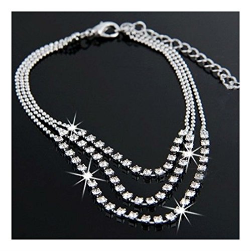 -. Feature : Type: 3 Rows Anklet Bracelet Material: Alloy Main Stone: Crystal, Rhinestone Gender: Women / Color: Silver Style: Europe and America Length: About 15cm / Weight: About 7g Dress collocation: All-match Usage: Can be used as anklet or bracelet / Package Includes: 1 X 3 Rows Anklet Bracelet