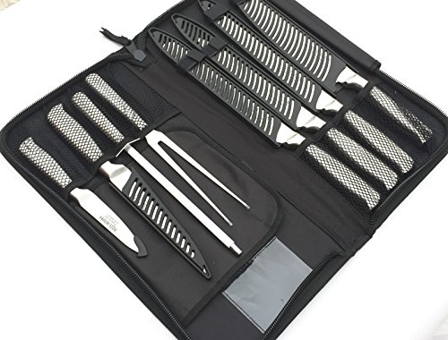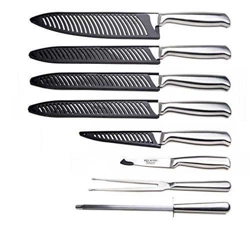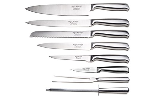 This fantastic Ross Henery Professional Eclipse Premium 8 piece knife set comes in a heavy duty zip up storage case which is perfect if you are traveling with the knives & Especially useful for catering students Because of the vast range of knives included within this set and the fact they are forged from one piece of stainless steel which eliminates food and dirt traps , offering the ultimate in safety & hygiene which is very important within the catering industry means They are perfect for the professional chef or total amateur as well as for the domestic house or college student. This set is made from high grade, high carbon 5CR 15MOV stainless steel. High carbon in the steel is important as this keeps the blades razor sharp and hold their edge well, a honing steel is included so you can keep the knives sharp at all times The set includes the following Items: 1 x 36cm Chefs knife 1 x 36cm Carving Knife 1 x 32cm Utility Knife 1 x 20cm Paring Knife 1 x 20cm Boning knife 1 x 34cm Bread Knife 1 x 30cm Sharpening Steel 1 x Carving Fork 1 x Zip up carry case The largest knives have protective sheathes on the blades which stops the knives cutting into the Velcro straps of the case and also protects the blades when stored away.