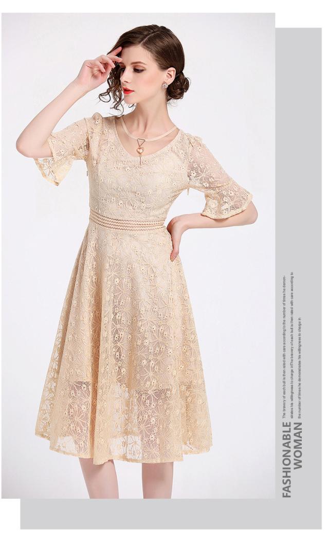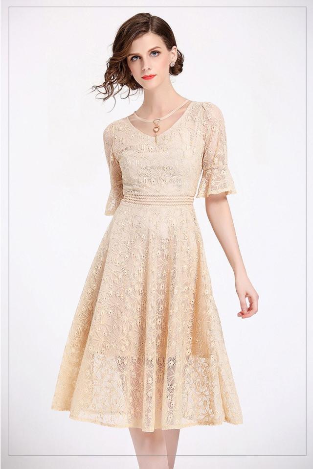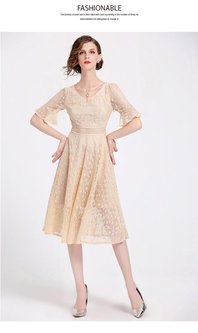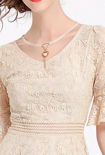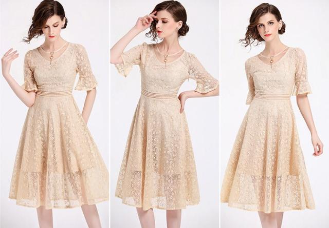 手の動きを優雅で華奢に見せてくれるフレアースリーブはレースの透け感との相乗効果で美しい手元を演出します。