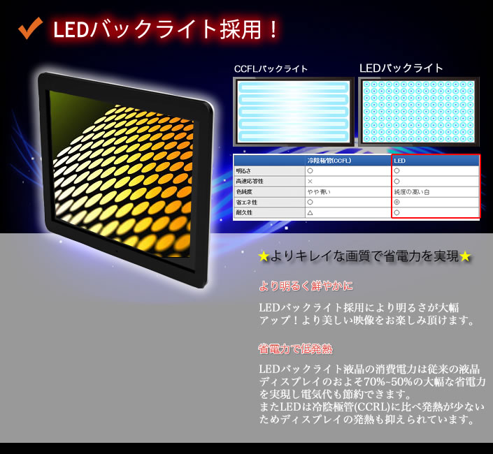 ●また、冷陰極管(CCRL)に比べ発熱が少ないため、ディスプレイの発熱も抑えられます。