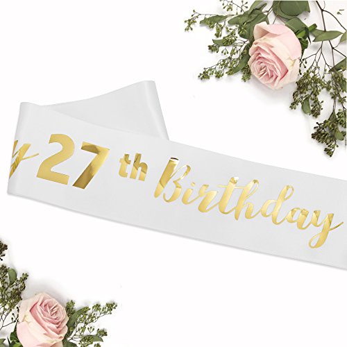 FCAROLYN “Happy 27th Birthday” - White Satin Sash with Gold Lettering - Birthday Girl Sash 27th Birthday Party Supplies