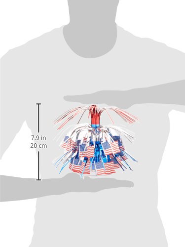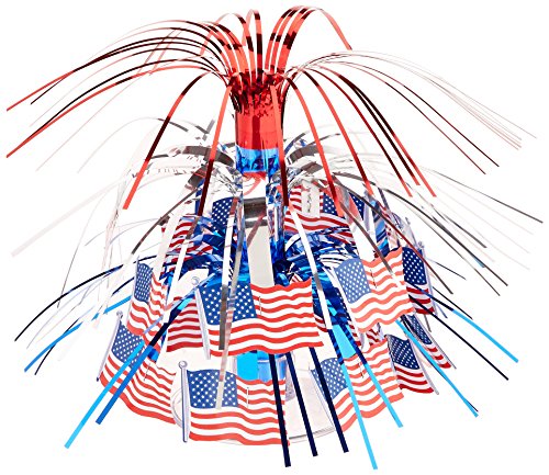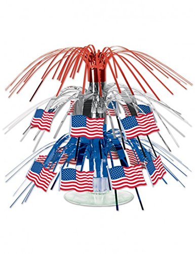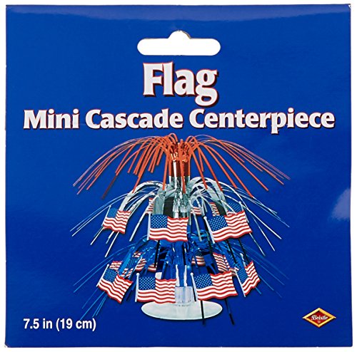 Studio : The Beistle Company Publisher : The Beistle Company Binding : Kitchen Product Description Beistle 57369 Flag Mini Cascade Centerpiece. The mini cascade centerpiece stands on a plastic platform and is made of shiny red, silver and blue metallic fringe with colorful printed American flags. Each centerpiece measures 71/2 Inch tall. Use this centerpiece on your tables for all the patriotic holidays. 0
