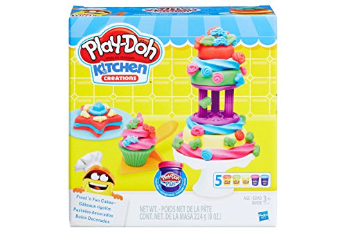 It's a Play-Doh frosting frenzy! Aspiring cake chefs can feel like pros with all the right tools to make lots of fun pretend cakes. Create Play-Doh Bundt cakes and crazy cakes that look like teddy bears and stars with the 3 cake molds, or build a crazy tiered cake with the 3 cake cutters and cake tier. Now for the best part - decorating! Cover the creations in fluffy Play-Doh Plus frosting with the frosting tool, which comes with 3 tips for a variety of shapes. Top it all off with make-believe candies, silly fruits, and other fun toppings with the half-molds, then show off the creations with the plate and utensils. The 2 creation cards can help inspire your junior chef with more fun things to make. With Play-Doh Kitchen Creations, the best ingredient of all is imagination! Hasbro, Play-Doh and all related properties are trademarks of Hasbro.Feature