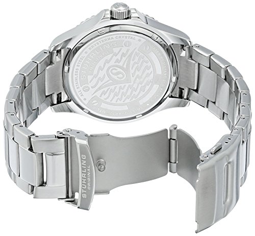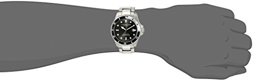 Black dial with applied circular and baton indices and date window at three o' clock position
