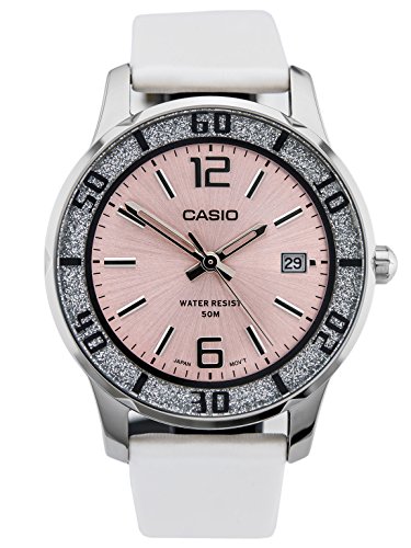 Brand, Seller, or Collection Name:Casio Model number:LTP1359D Part Number:LTP1359SL-4AV Item Shape:Round Dial window material type:Mineral Display Type:Analog Clasp:Buckle Case material:Stainless steel Case diameter:37 millimeters Case Thickness:10.8 millimeters Band Material:leather Band length:Women's Standard Band width:16 millimeters Band Color:Off White Dial color:Pink Special features:N/A Movement:Quartz: Battery Water resistant depth:50 Meters