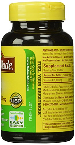 -. Binding : Health and Beauty -. Brand : Nature Made -. Color : multicolored -. EAN : 0031604014896 -. Feature : Pack of 3 100-count bottles (total of 300-counts) / Boosts the immune system for a healthier lifestyle / Works in conjunction with vitamin E to promote antioxidant activities / Helps neutralize free radicals / No artificial colors, flavors, or preservatives -. IsAdultProduct : 0 -. Label : Nature Made -. Manufacturer : Nature Made -. Model : hhh-kyyy-tra-rat7835 -. MPN : EV-V5FE-QV0T -. NumberOfItems : 3 -. PackageQuantity : 3 -. PartNumber : EV-V5FE-QV0T -. ProductGroup : Health and Beauty -. ProductTypeName : HEALTH_PERSONAL_CARE -. Publisher : Nature Made -. Size : 300 -. Studio : Nature Made -. Title : Nature Made Vitamin C 1000mg, 100 Tablets (Pack of 3) -. UPC : 031604014896