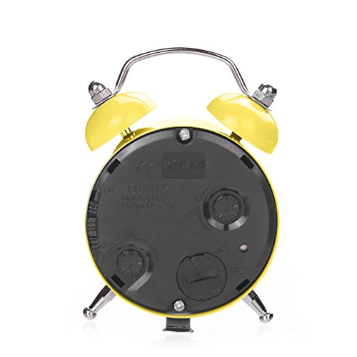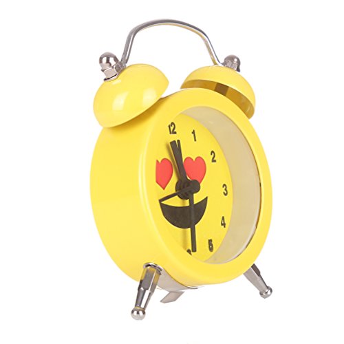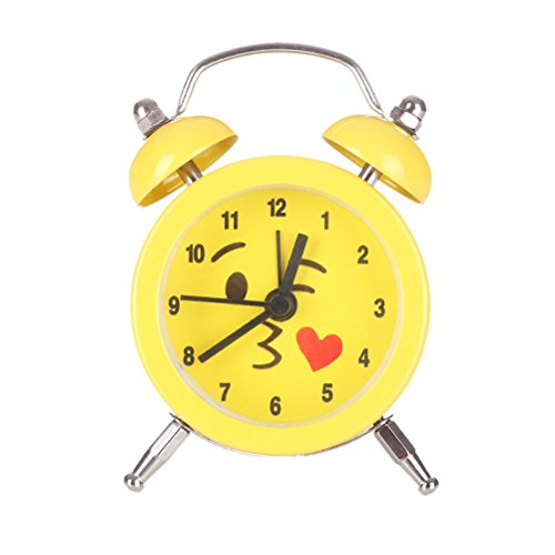 - Color: Yellow. - Material: Metal and glass. - Size: Approx. 7.7 x 5 x 1.8 cm / 3 x 2 x 0.7 inch. - Weight: 50g. - A LP44 button battery is available. - Super loud bell ring to wake you up. - Built in high quality non-ticking mechanism, keeping time exact and accurate and making working time longer. Non-ticking movement gives you a restful environment to fall asleep easily and quickly. - The emoji alarm clock is applicable for those who are difficult in getting up. - This twin bell alarm clock is a perfect choice for presenting gifts.