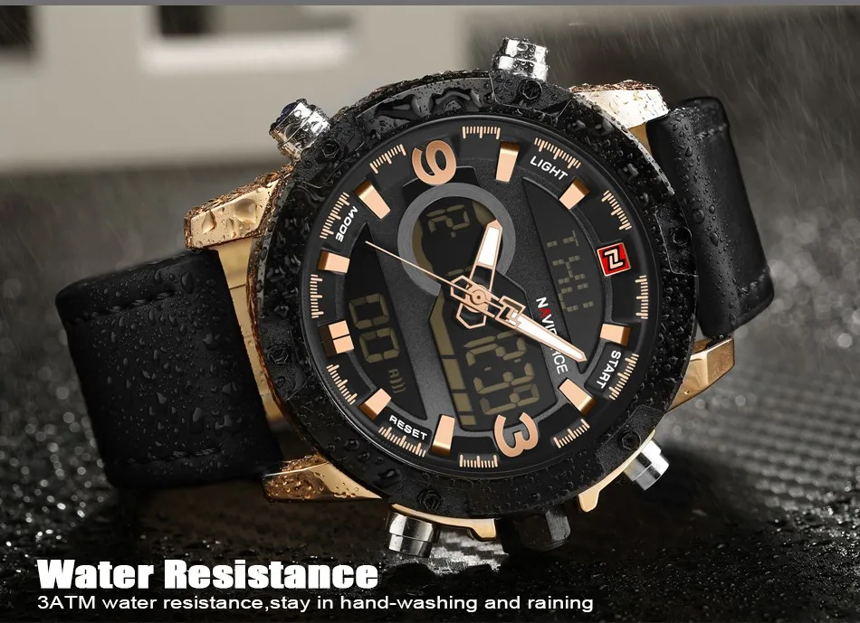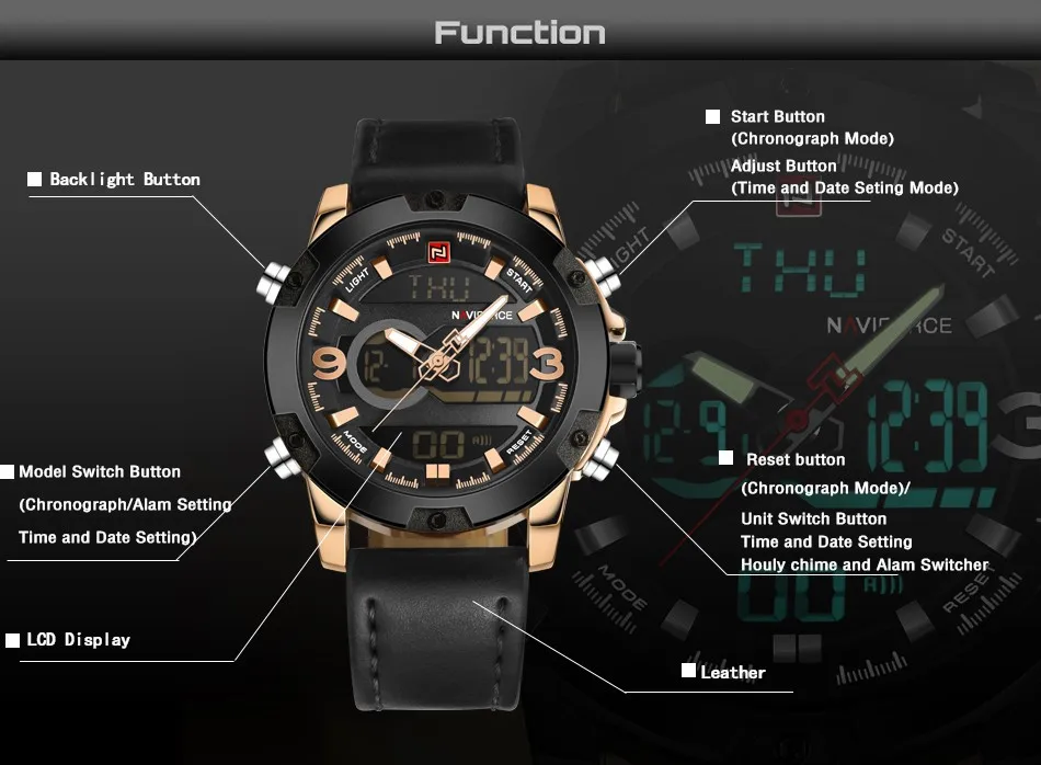 Feature:Alarm,Back Light,Water Resistant,Shock Resistant,Stop Watch,Chronograph,Auto Date,LED display