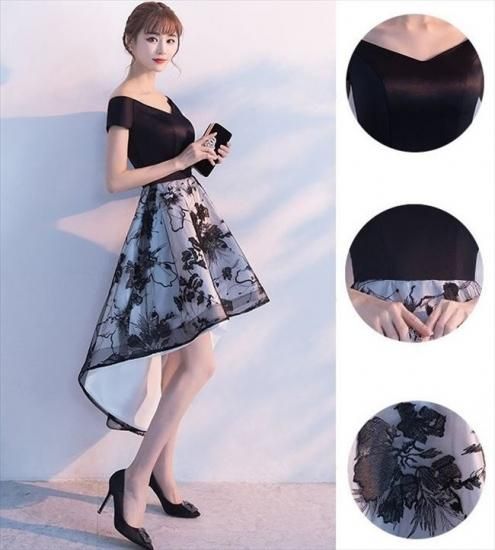 パーティードレス ミモレ丈 ワンピース フィッシュテール ブラック 刺繍 Vネック 大人 上品 お呼ばれ drgz2718