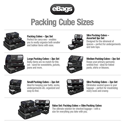 -. Binding : Apparel -. Brand : eBags -. Department : unisex-adult -. Feature : Dimensions: 2.8 x 14 x 5 in - great for socks, tee shirts, underclothes / Guaranteed for life under the eBags Lifetime Warranty / Includes premium YKK zippers with corded pulls for a lifetime of opening and closing / Interior seams fully finished for durability and soft mesh tops won't damage delicate fabrics / Highest construction standards utilized - making it the number one packing cube brand -. Label : eBags -. Manufacturer : eBags -. PackageQuantity : 1 -. ProductGroup : Apparel -. ProductTypeName : BAG -. Publisher : eBags -. Size : One Size -. Studio : eBags -. Title : eBags Slim Packing Cubes - 3pc Set
