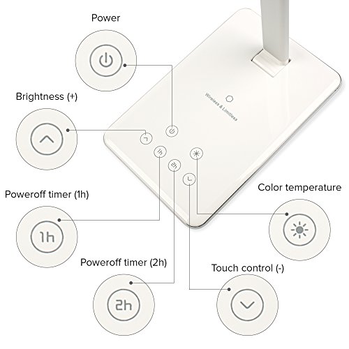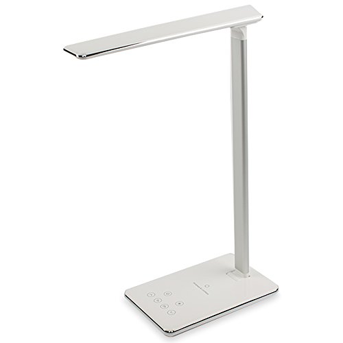 CUTTING EDGE LIGHTING TECHNOLOGY: This superior quality, ENERGY SAVING LED desktop lamp also features sleek TOUCH SCREEN BUTTONS, as well as a convenient TIMER POWEROFF and is ideal for casual reading, school studying, late night working at the office or even for detailed drafting work. Its ALUMINUM FRAME is durable and flexible, thus providing maximum illumination from a variety of angles. Included in the package is an AC charger and cable for your convenience.